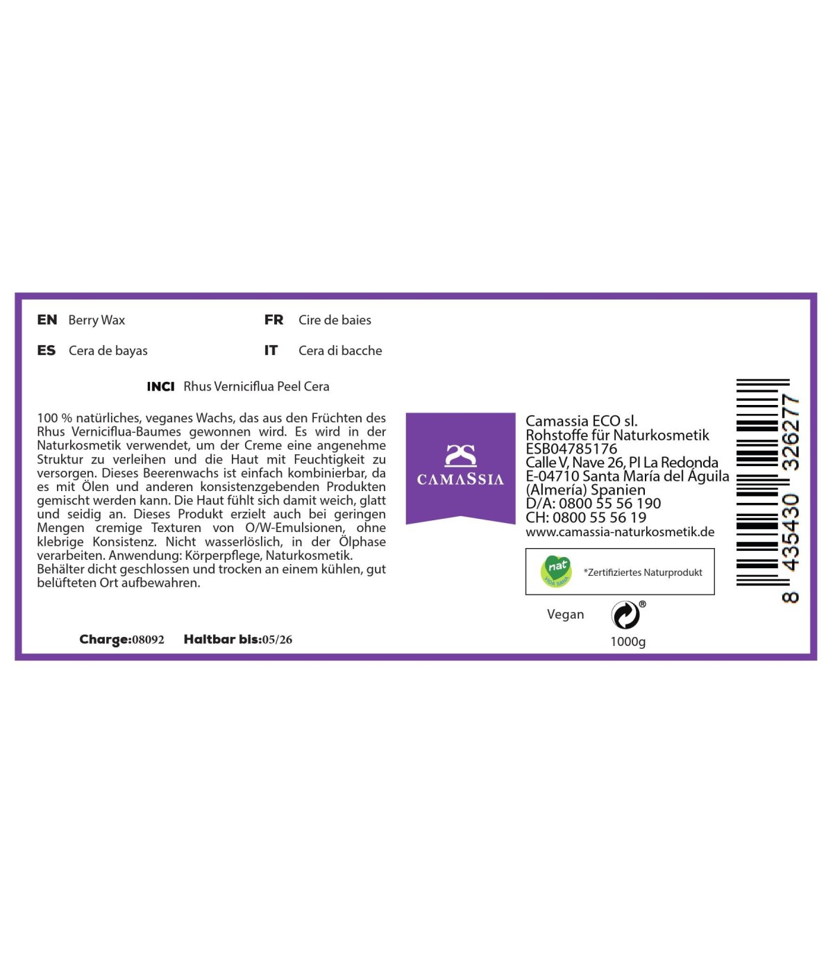 Beerenwachs (Berry Wax) ist ein 100 % natürliches, veganes und vegetarisches Wachs, das aus den Früchten des Rhus Verniciflua-Baums gewonnen wird. Es wird in der Naturkosmetik verwendet, um eine feine, weiche Struktur zu erzeugen und die Haut zu pflegen und zu rehydrieren. Zudem wirkt es leicht koemulgierend und konsistenzgebend. Dieses Wirkstoffwachs lässt sich hervorragend mit Ölen und anderen fetthaltigen Inhaltsstoffen kombinieren.