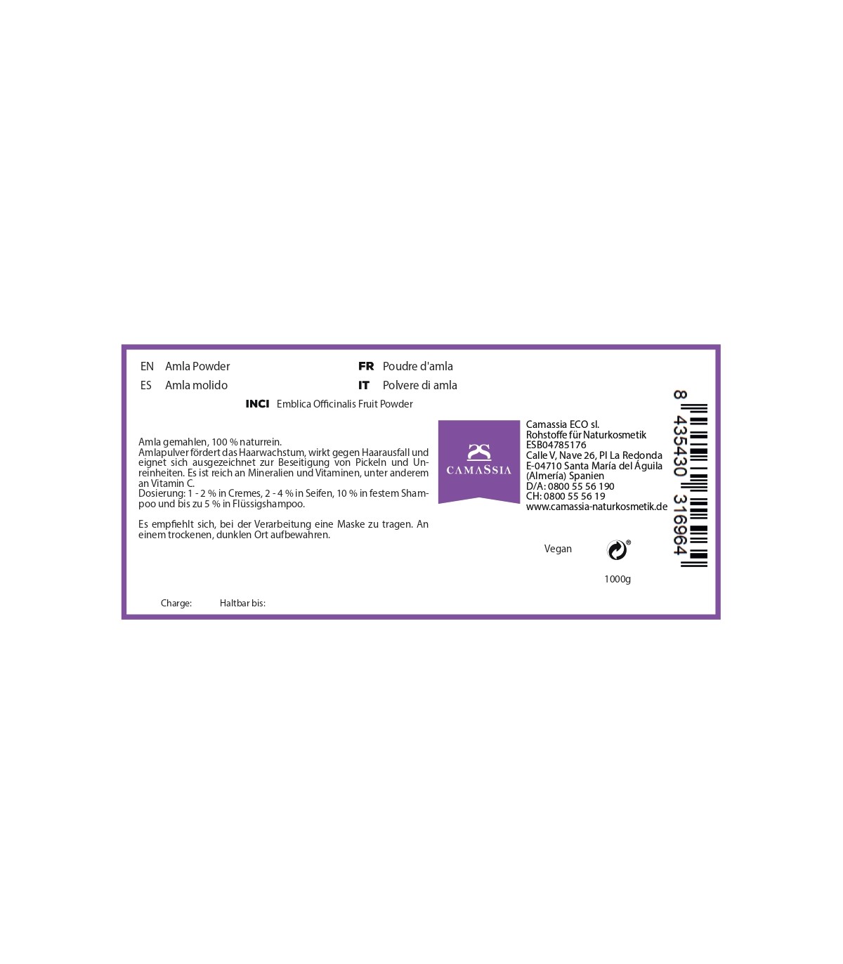 Unser 100 % natürliches Amla-Pulver (indische Stachelbeere) enthält antioxidative Polyphenole, entzündungshemmende Triterpenoide und ätherische Öle. Des weiteren zeichnet sich Amla durch Aminosäuren, Mineralien, Fettsäuren, Gerbstoffe und Glykoside aus.