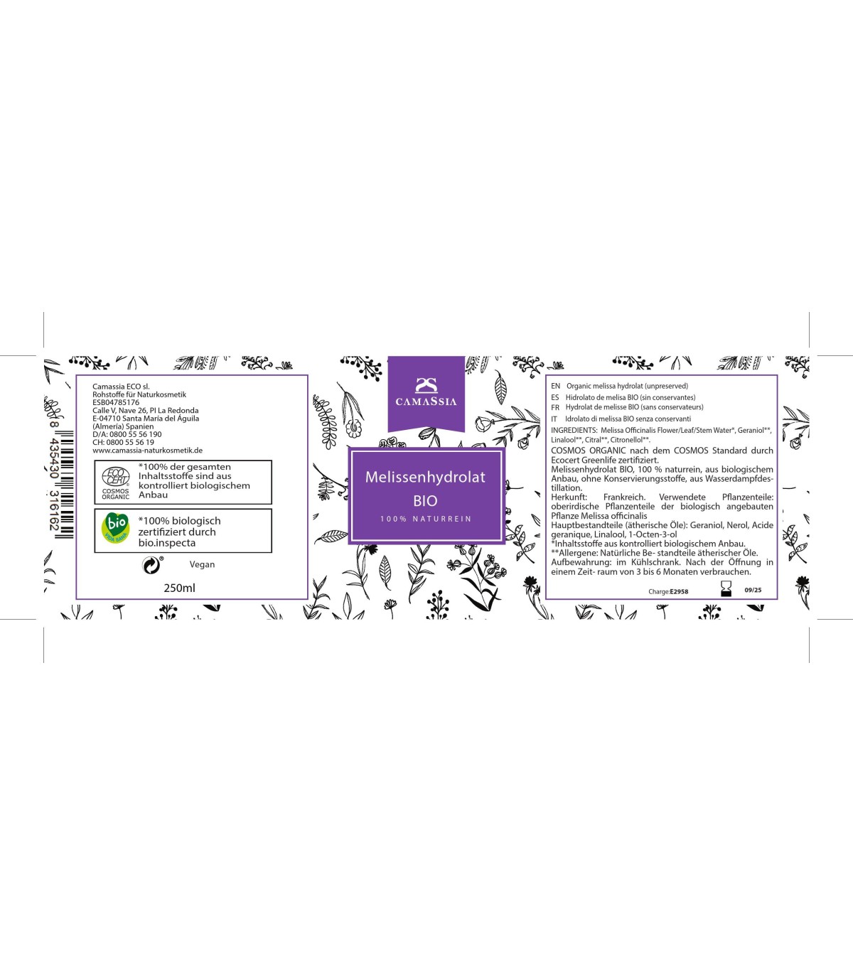 Melissenhydrolat BIO, 100 % naturrein aus biologischem Anbau ohne Konservierungsstoffe