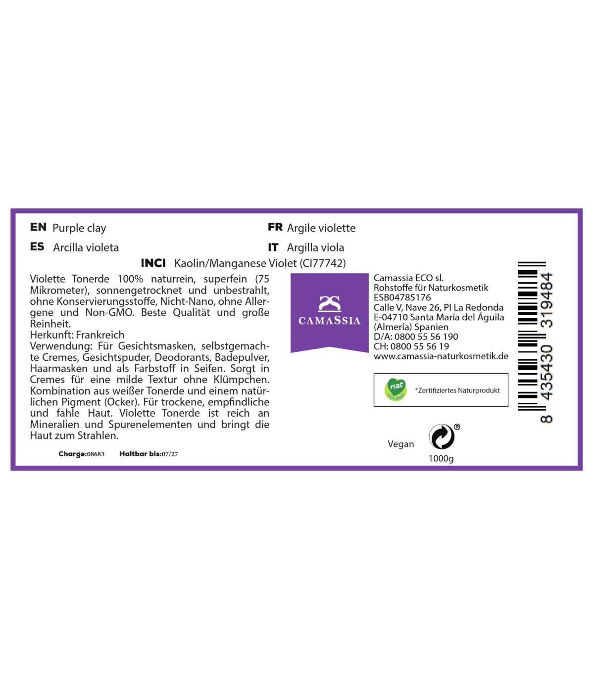 Superfeine violette Tonerde, sonnengetrocknet, nicht bestrahlt (nicht ionisiert), ohne Konservierungsstoffe oder andere Behandlungen, frei von Allergenen, frei von Nanopartikeln und frei von genetisch veränderten Organismen.