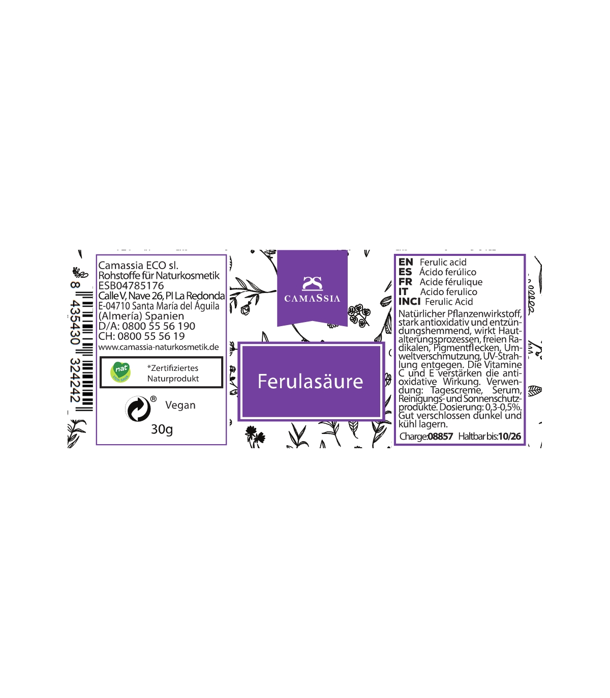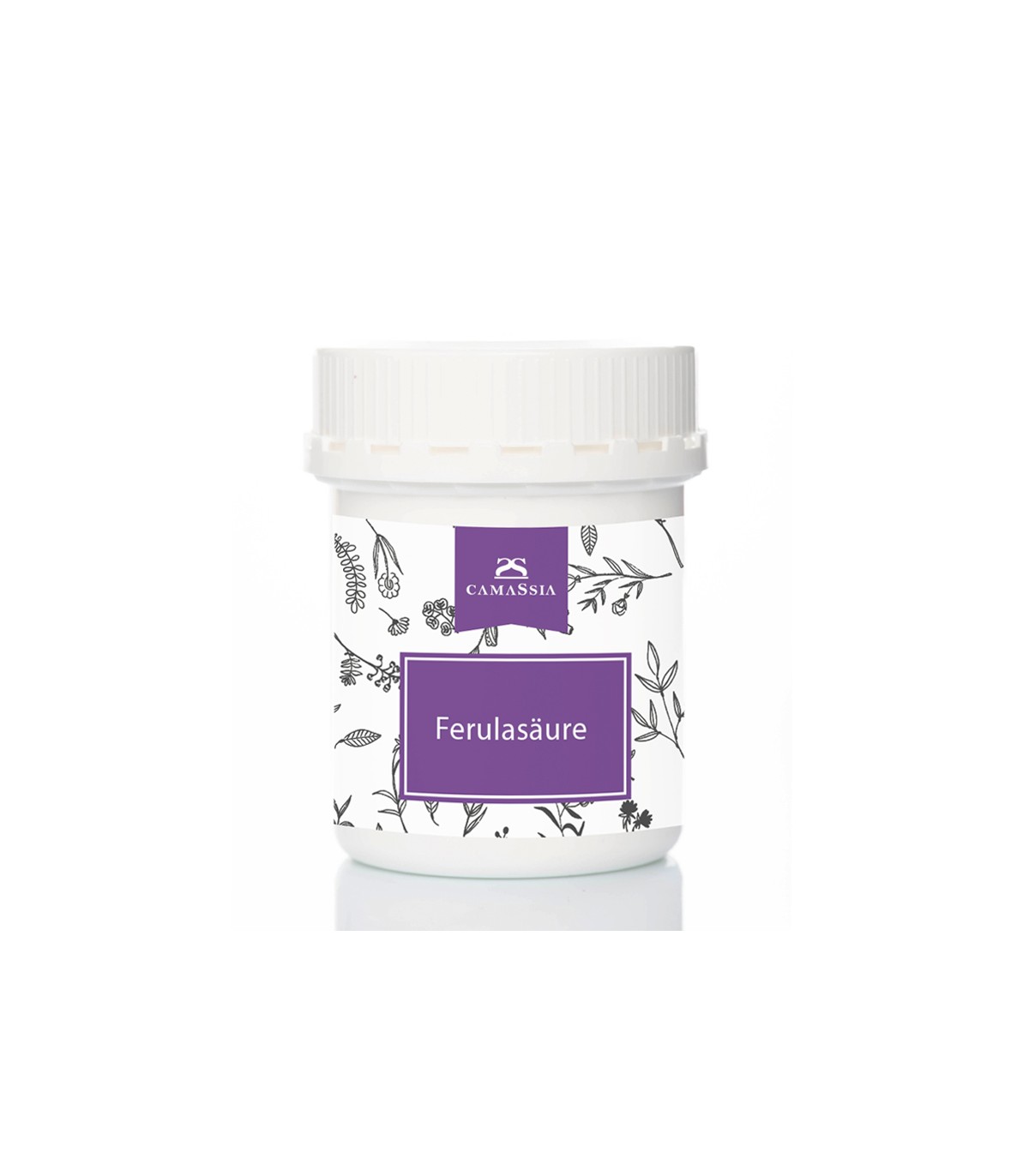 Du erhältst Ferulasäure preiswert in unserem Online-Shop Camassia Naturkosmetik. Es handelt sich um ein starkes, natürliches Antioxidans, das entzündungshemmend wirkt und rein pflanzlichen Ursprungs ist (Ferulasäure ist in Hülsenfrüchten, Getreide, Früchten und Samen zu finden). Diese Säure wirkt der Hautalterung entgegen, indem sie vor freien Radikalen, Umweltverschmutzung, UV-Strahlung, Pigmentflecken und Oxidation schützt.