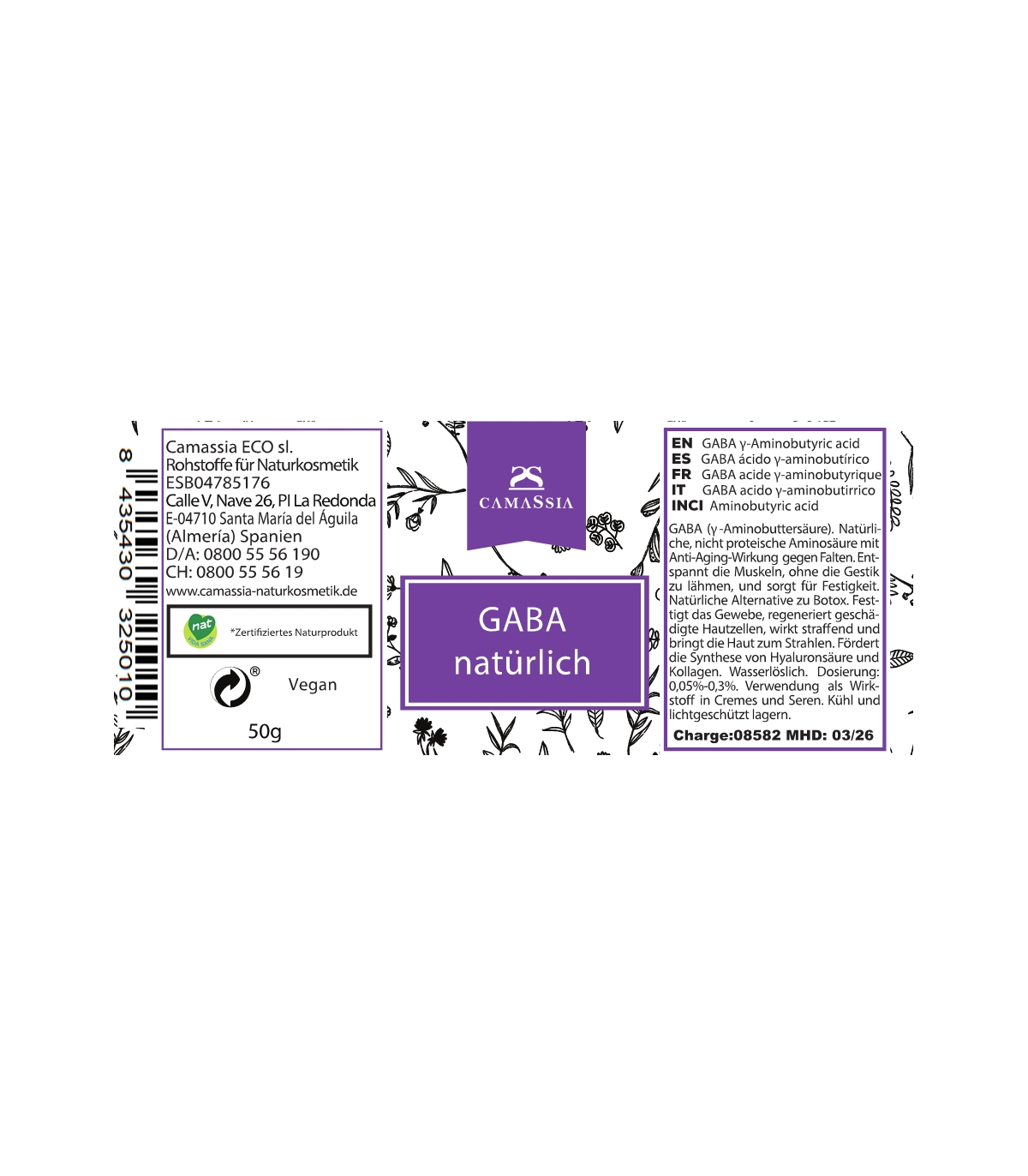 Natürliches GABA (Gamma-Aminobuttersäure) wirkt ähnlich wie Botox. Du erhältst diesen kosmetischen Wirkstoff in unserem Online-Shop Camassia Naturkosmetik und kannst damit Cremes selber machen, um Alterungserscheinungen vorzubeugen. Diese Aminosäure reduziert Falten und kommt deshalb in Anti-Aging-Produkten vielfach zum Einsatz. Dieser Wirkstoff wird durch die bioenzymatische Fermentation von L-Glutaminsäure hergestellt.
