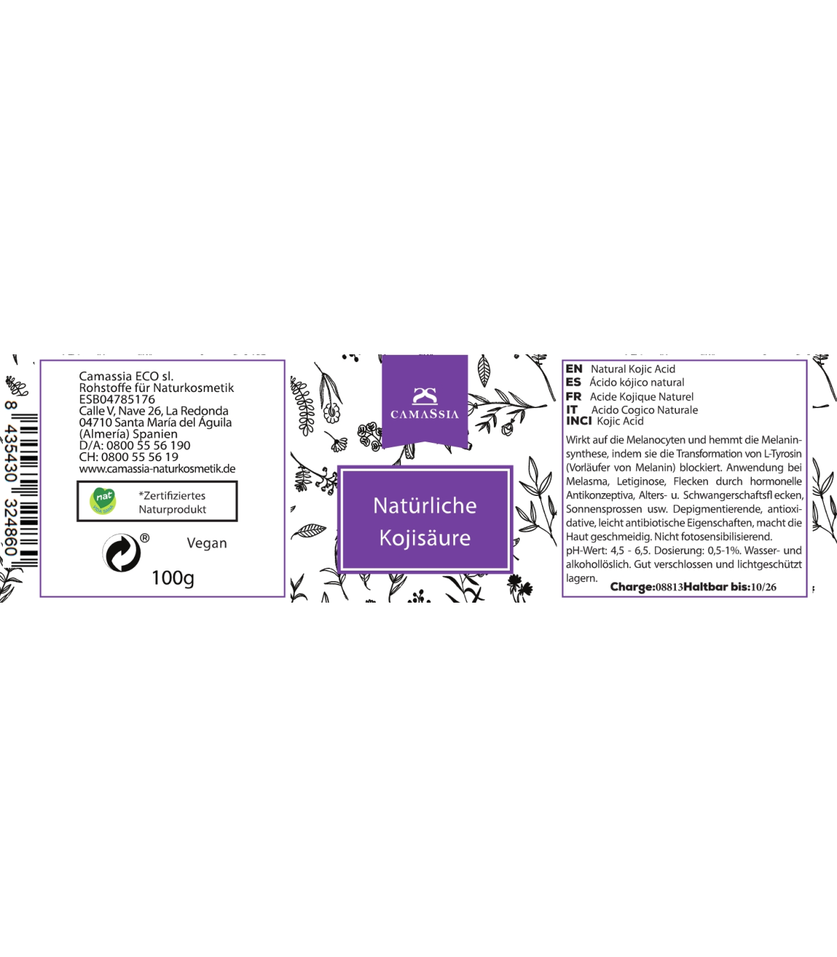Die natürliche Kojisäure, die wir in unserem Online-Shop Camassia Naturkosmetik zum besten Preis anbieten, hilft bei der Behandlung von Melasma, Letiginose, Antibabypillenflecken, Altersflecken, Schwangerschaftsflecken und Sommersprossen. Sie hat außerdem eine leicht antibiotische Wirkung.