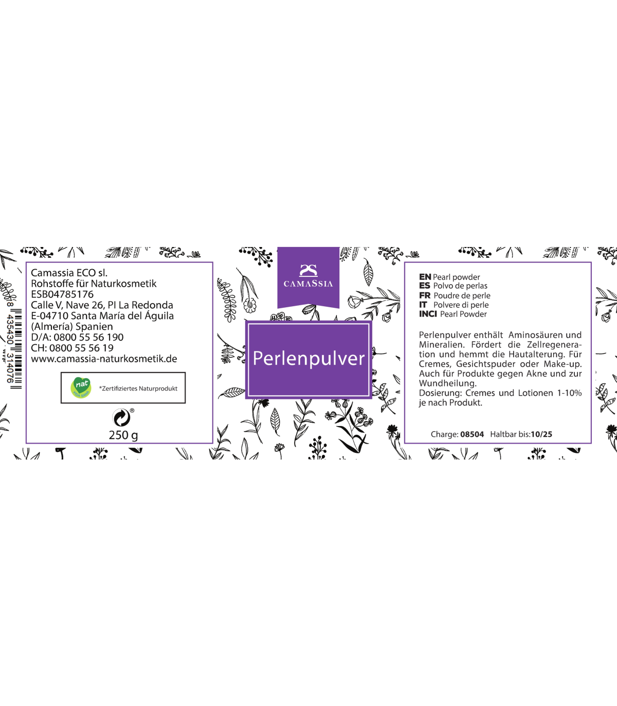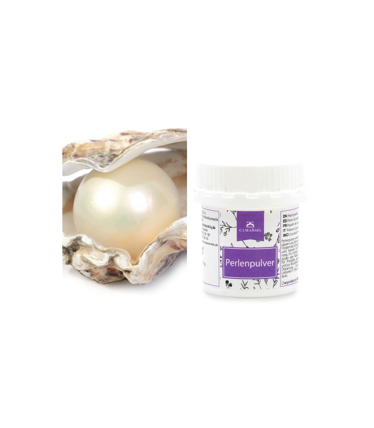 Perlenpulver enthält Aminosäuren und Mineralien, wie Selen, Lithium, Phosphor, Eisen, Magnesium, Jod und Zink. Es fördert die Zellregeneration und verlangsamt den Alterungsprozess der Haut. In Asien wird Perlenpulver schon seit Langem für medizinische und kosmetische Anwendungen verwendet. Es hilft gegen Falten und begünstigt die Elastizität der Haut.